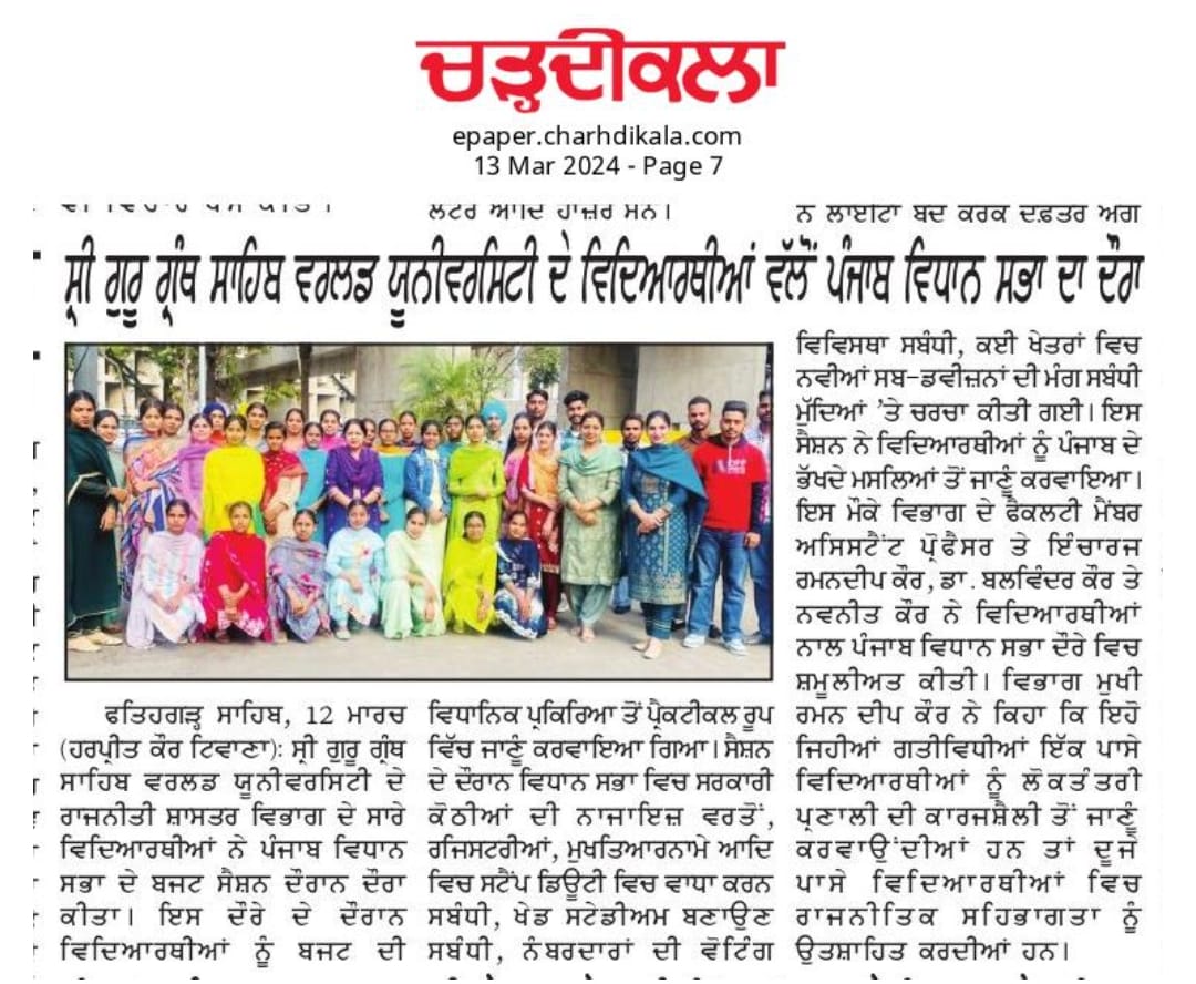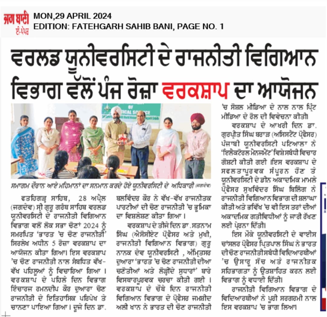 The Department of Political Science is dedicated to the systematic study of political ideas, institutions, processes and behaviour at the local, national and international level. Since its inception, the department has aimed to cultivate critical understanding and informed citizenship among students by inculcating analytical, theoretical and empirical approaches to the study of politics. The curriculum of the department is designed to provide a comprehensive understanding of the core areas of political theory, comparative politics, public administration, international relations and Indian political system. It emphasiszes both classical and contemporary perspectives, enabling students to engage critically with contemporary political, social and global issues. In addition to classroom learning, the department encourages research oriented activities, seminars, debates and field trips to promote intellectual curiosity and practical understanding of governance and policy-making.