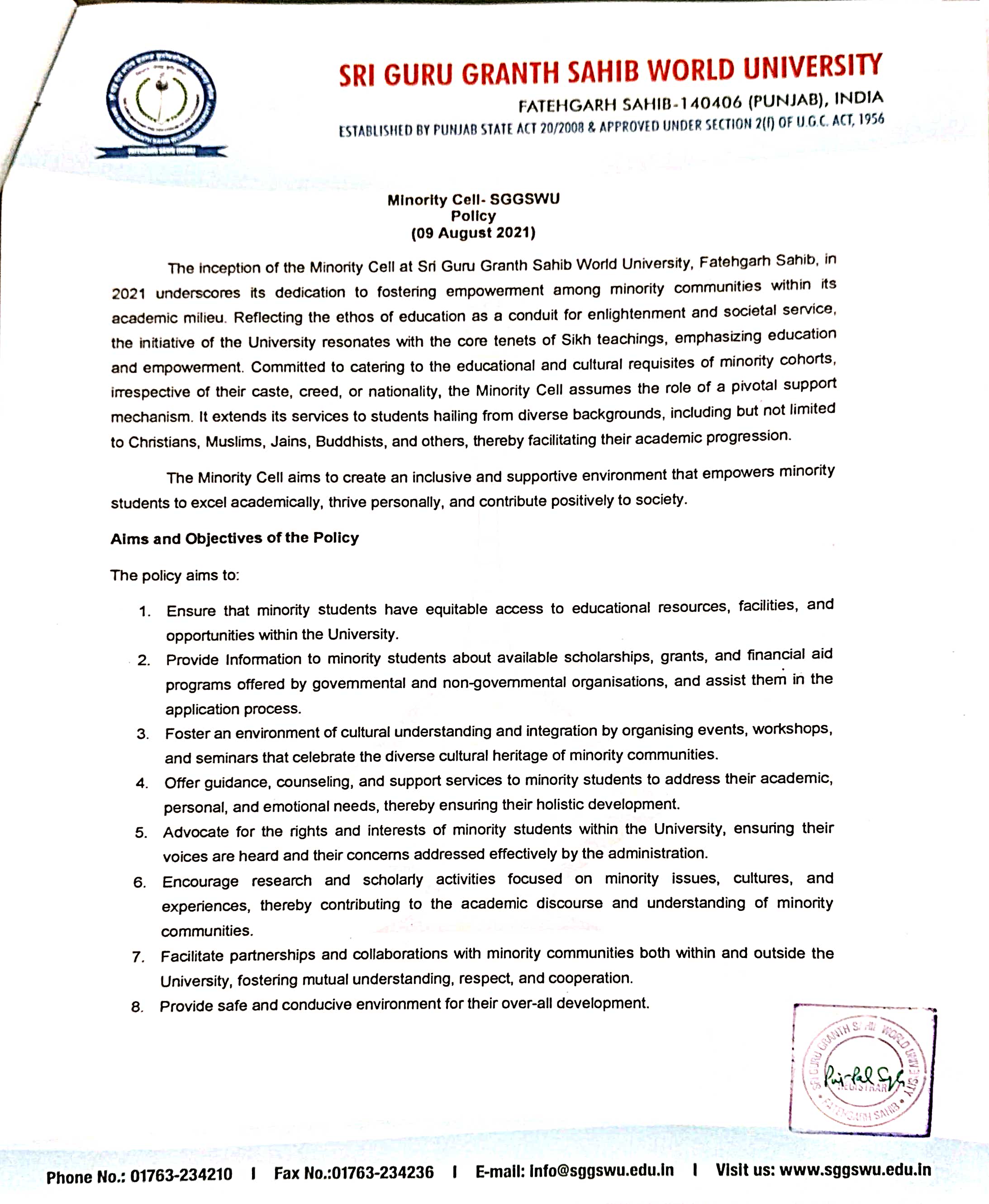By institutionalizing a dynamic and value-driven policy ecosystem, Sri Guru Granth Sahib World University reaffirms its unwavering commitment to academic integrity, social responsibility, and the creation of globally competent, ethically grounded citizens.