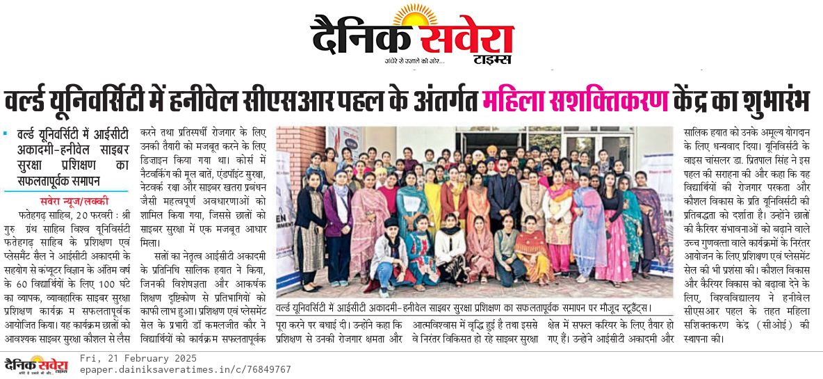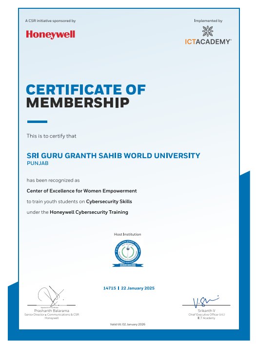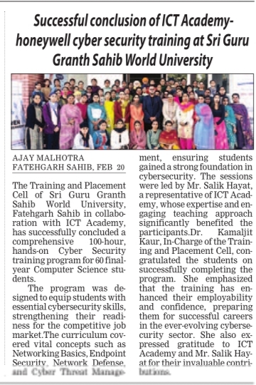 The Training and Placement Cell of Sri Guru Granth Sahib World University, in collaboration with ICT Academy, successfully concluded a 100-hour hands-on, activity-based Cyber Security Training Program for 60 final-year Computer Science students, conducted from 22nd January to 11th February 2025.