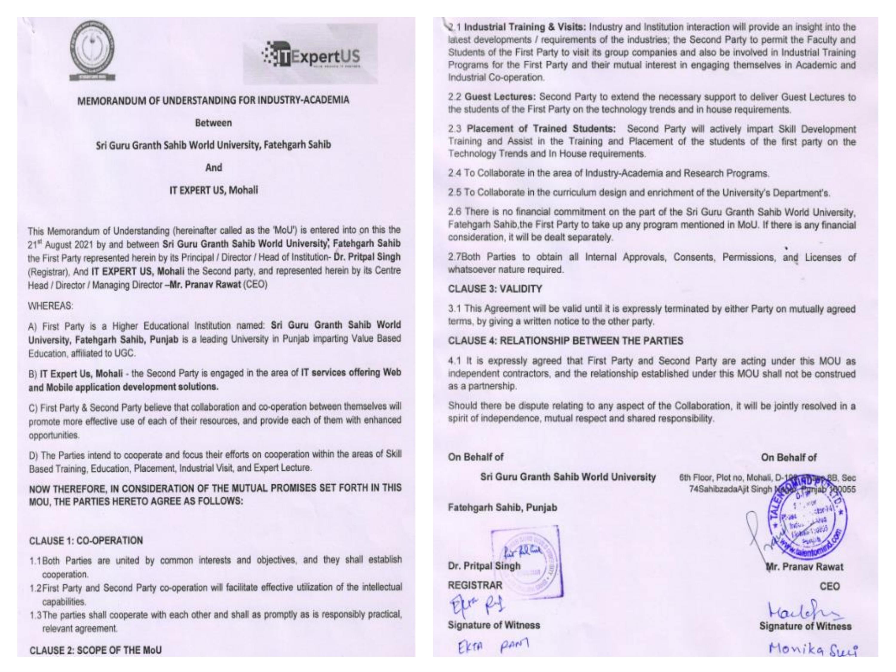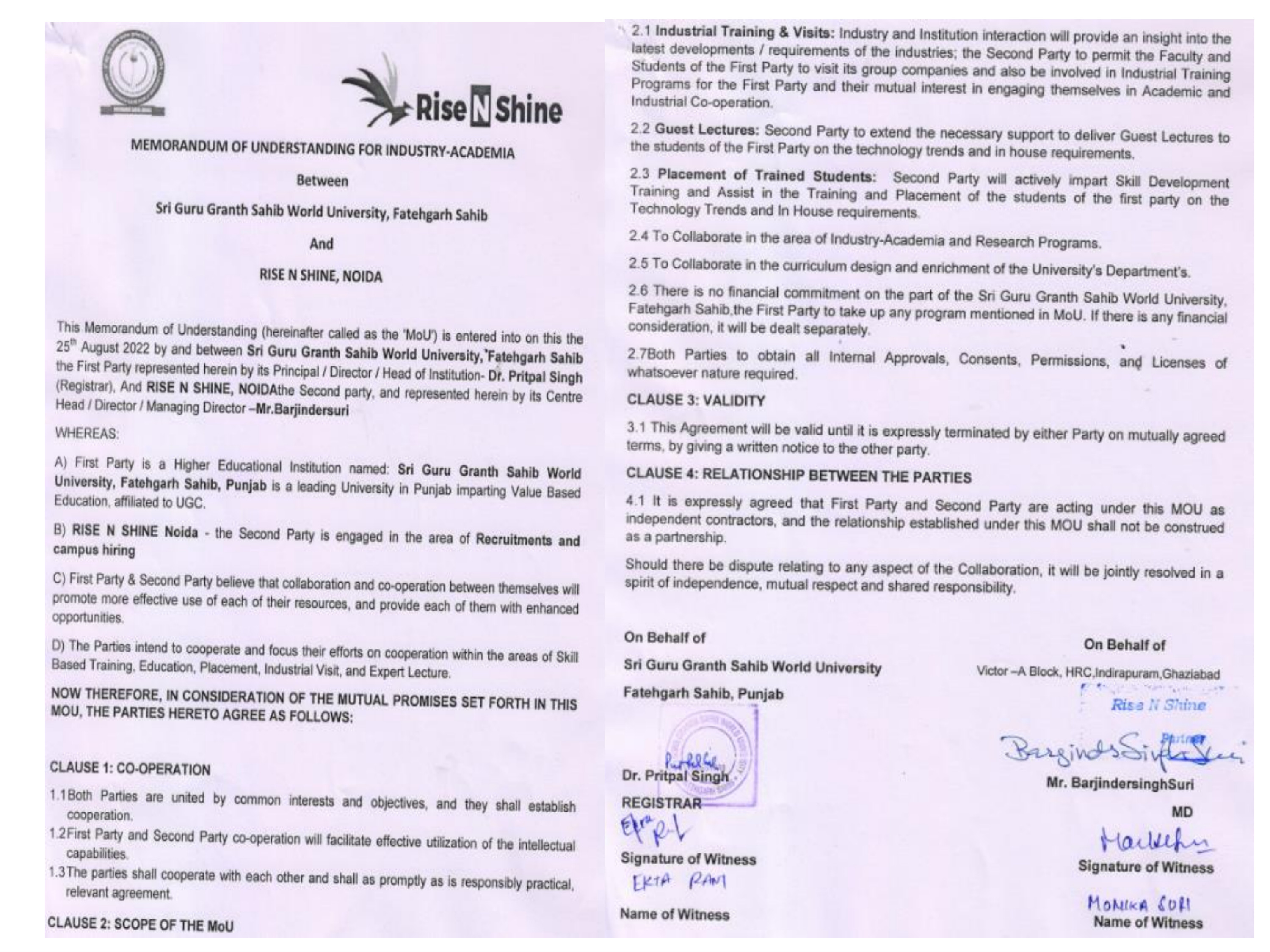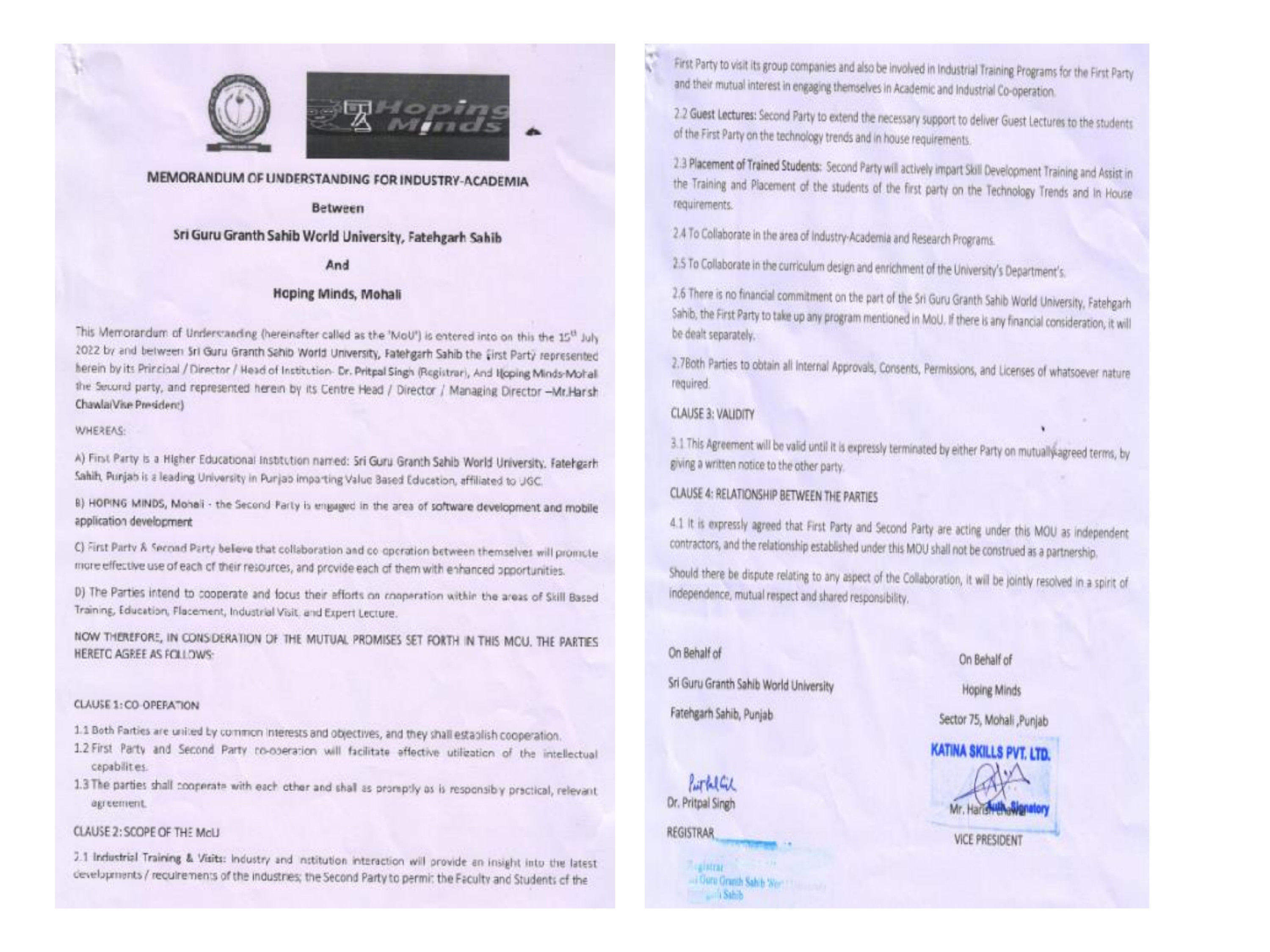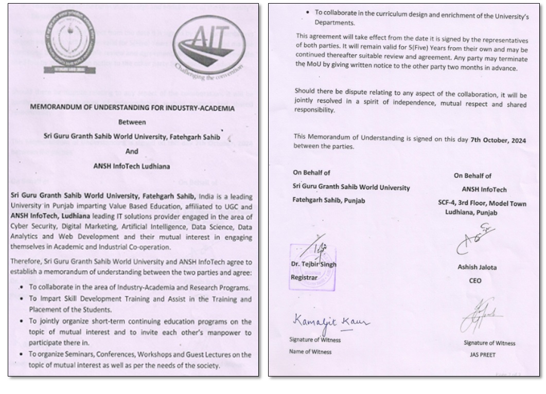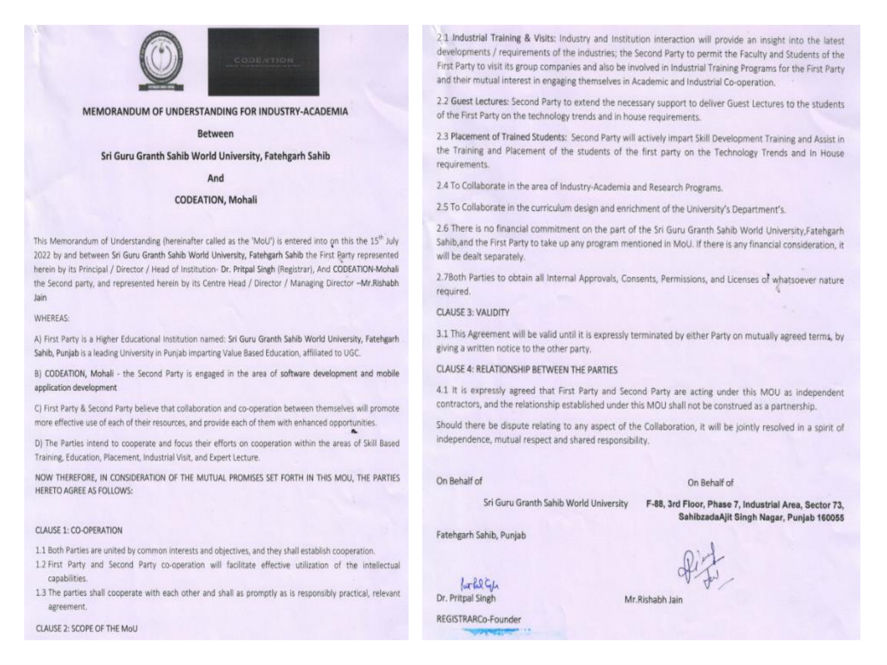 The university actively collaborates with leading industries and organizations through strategic partnerships and Memoranda of Understanding (MoUs). These alliances are designed to enhance the academic environment by integrating real-world exposure, advanced technologies, and industry-driven best practices into the curriculum.